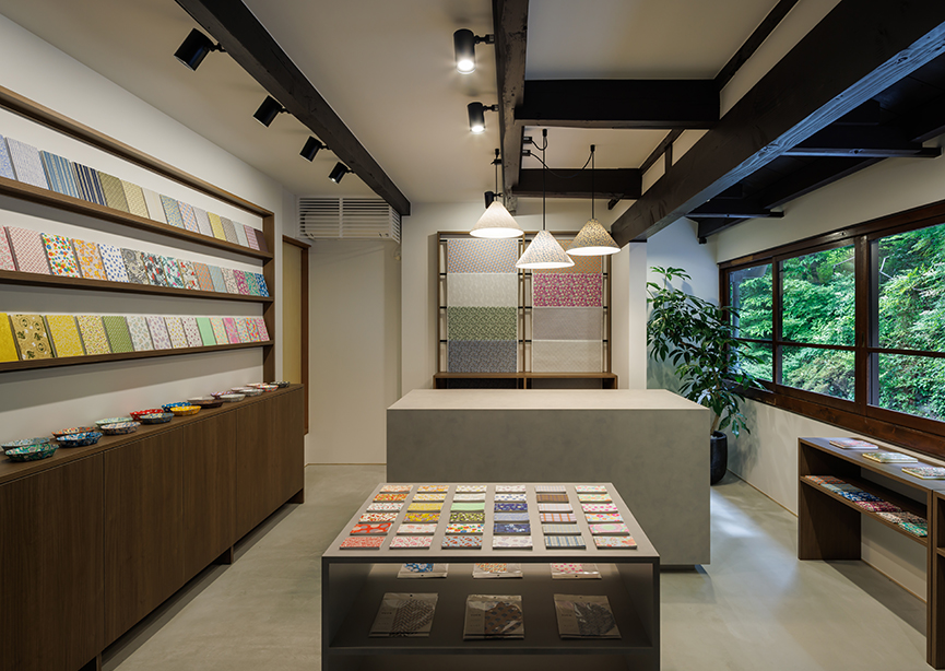 A long counter accommodates full sheets of Yuzen washi, with a hanging rack behind it that displays bold patterns in their entirety.