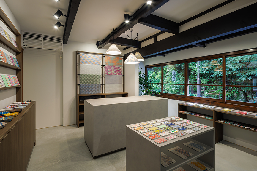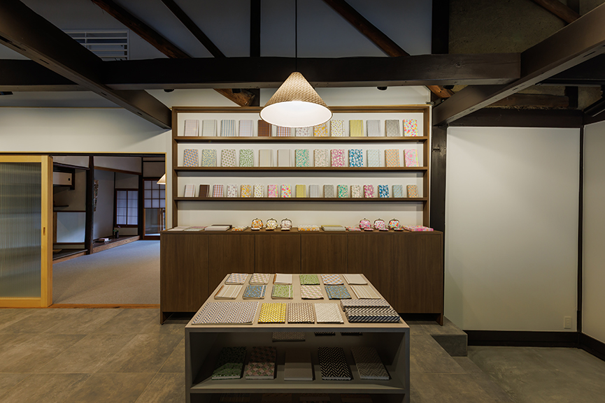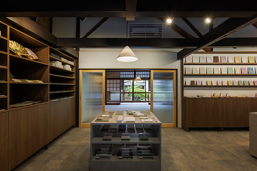 The house is organized in two main areas: a shop that faces the street, and a meeting space that opens onto a garden with a traditional tokonoma alcove. From the road, Shogado’s notebooks and goshuincho (temple stamp books) catch the eye through the windows, drawing people into the space.