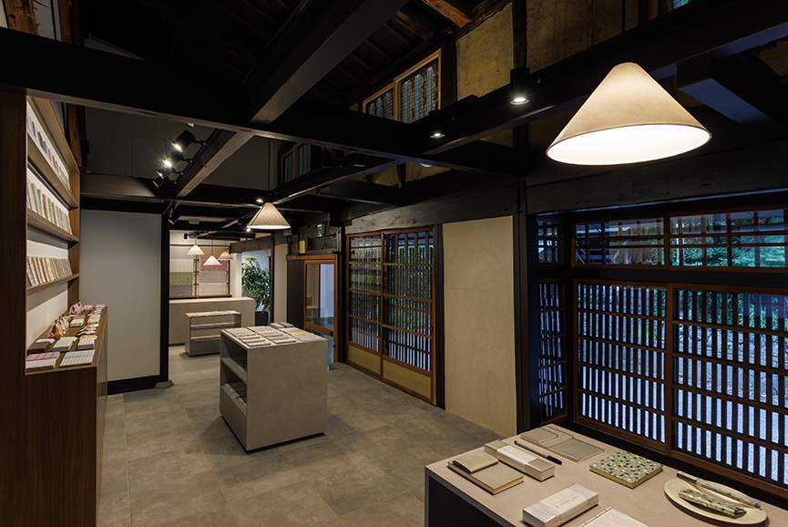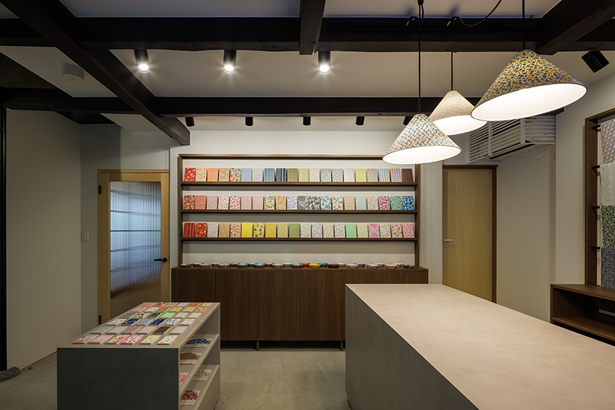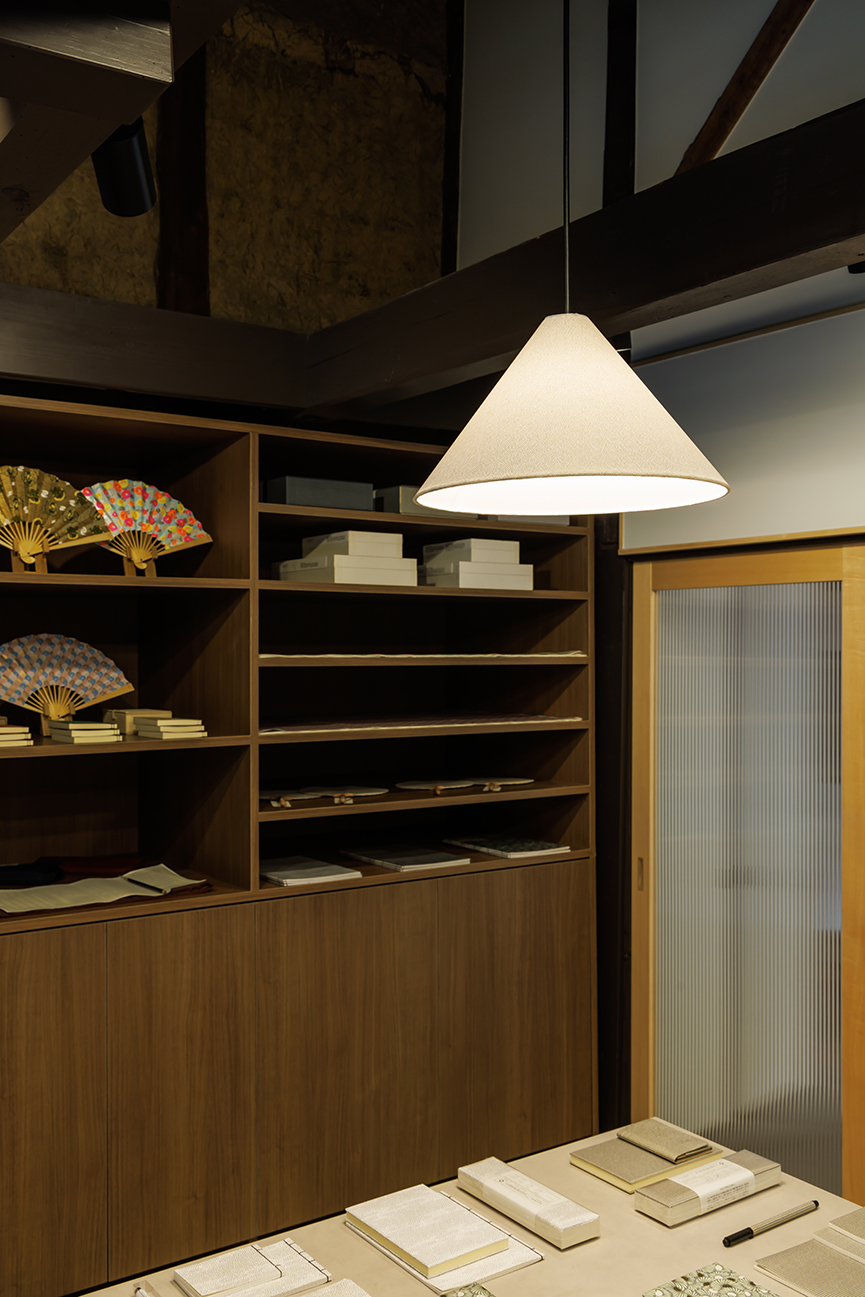 Lighting was carefully planned to support both the atmosphere and the presentation of the products. Spotlights fixed to the beams are angled to softly illuminate the space without creating glare. Pendant lamps made from Yuzen washi paper glow as beautiful features, both familiar and unexpected.