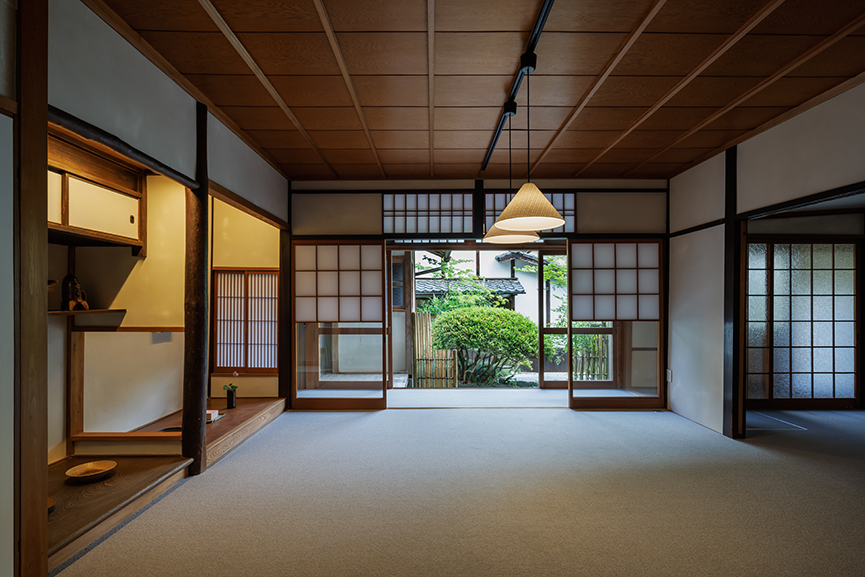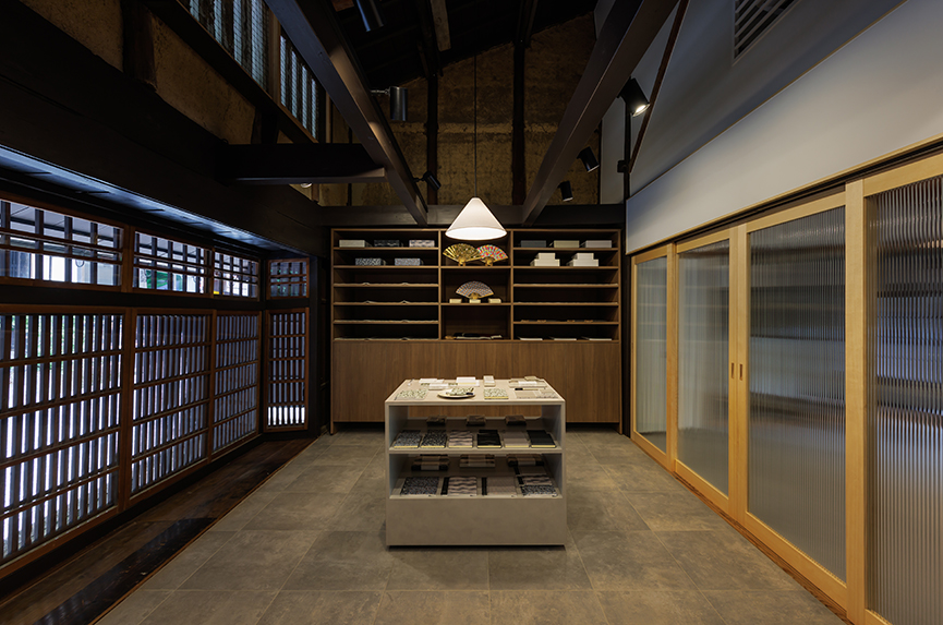 Inside the shop, the western side has been opened fully to the attic, allowing natural light to pour in through the mushikomado lattice windows and creating a feeling of openness and air. These mushikomado, named for their resemblance to traditional insect cages, are a key characteristic of tsushi-nikaimachiya. (Typically covered in a thick layer of plaster, they were originally used as a fire prevention measure during the fire-prone Edo period.) Their inclusion offers not only light but also a subtle link to thearchitectural practices of the past.