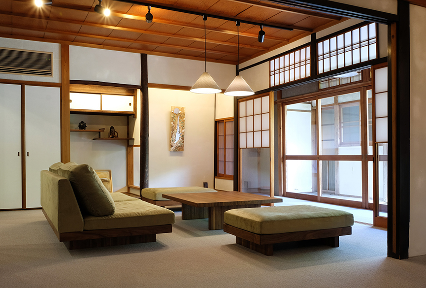 A sofa and low table face the tokonoma, where visitors can look through snow-viewing shoji to see the azaleas in the garden, plants that have grown alongside the house for nearly a century.