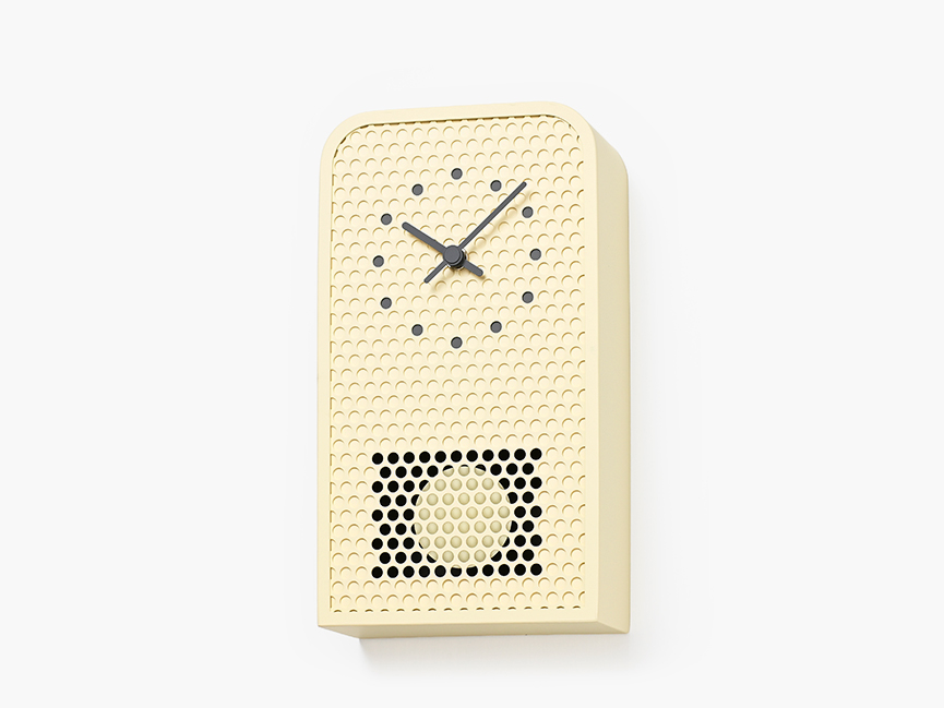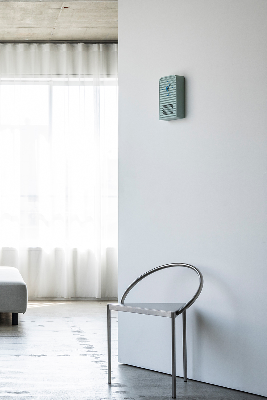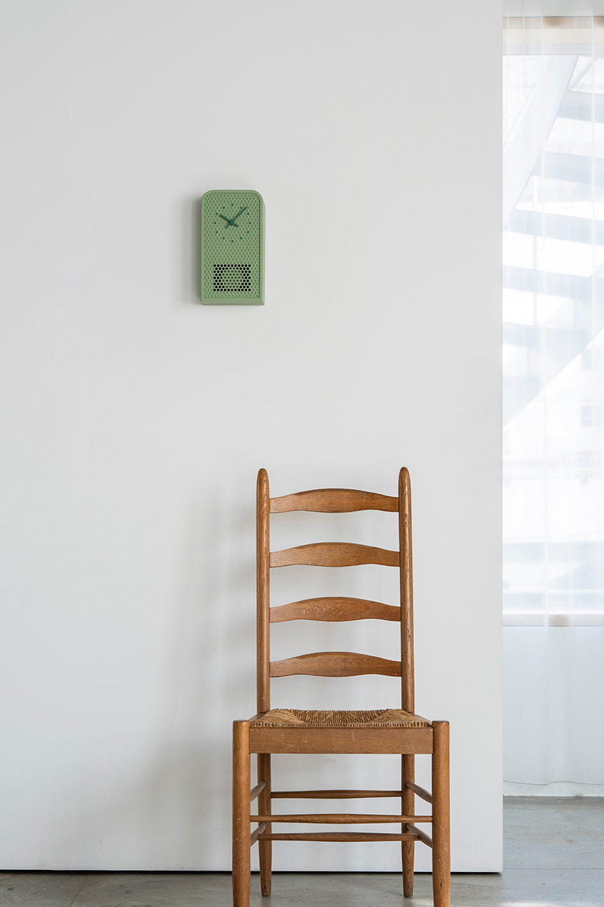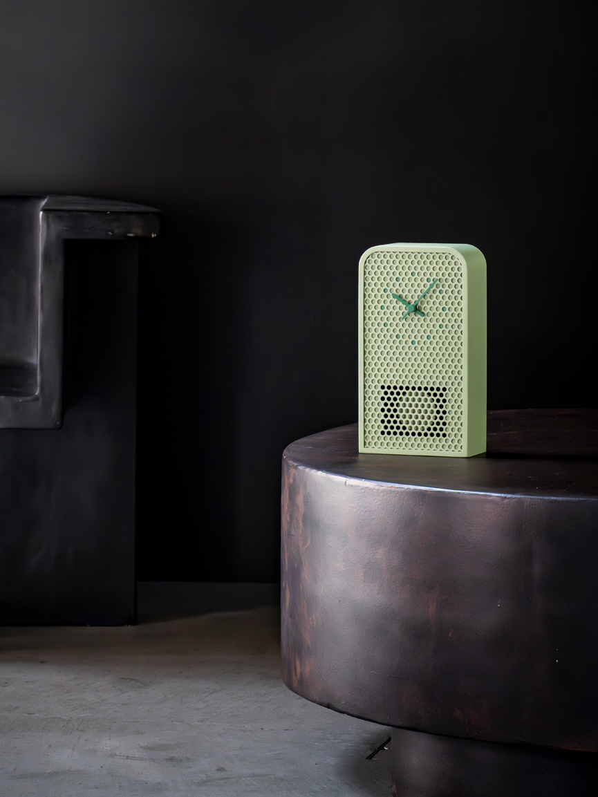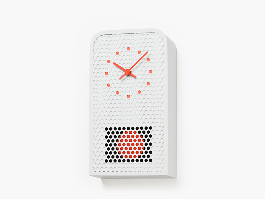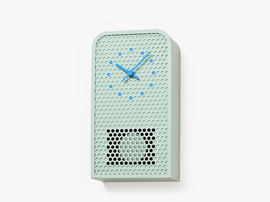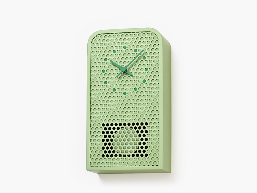 MOOV is a contemporary pendulum clock crafted from perforated metal. While retaining the familiar structure and function of a classic pendulum clock, MOOV offers a fresh take. The pendulum remains partially visible through the circular cutouts, allowing movement and light to subtly fill the design. This interplay between transparency and rhythm highlights the unique character of the material. The clock’s indexes are precisely aligned with selected cutouts and finished in complementary tones, creating a seamless connection between form and function.
